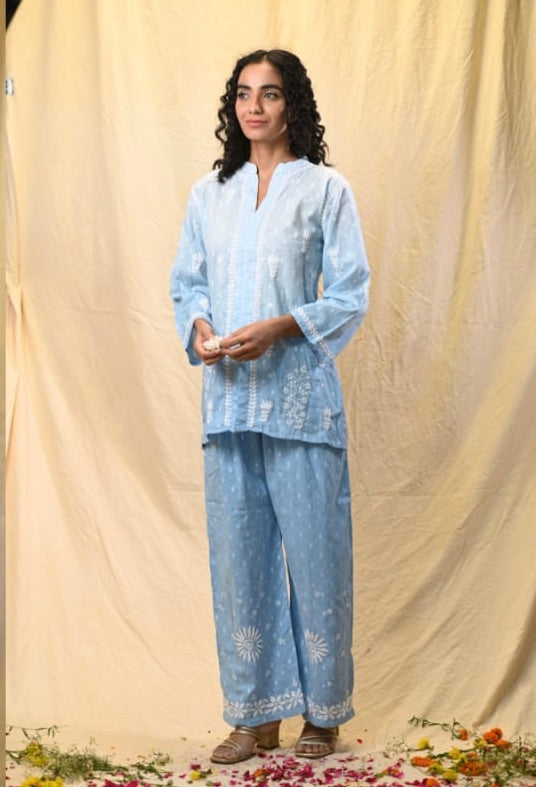 Sky Blue Krishna Boota Co-ord Set – Hand Embroidered Lucknowi Chikankari