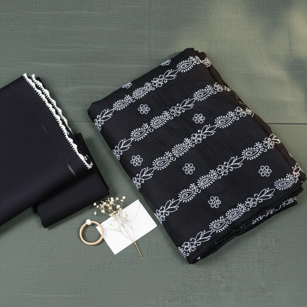 Black Cotton Unstitched Chikankari Suit with White Embroidery